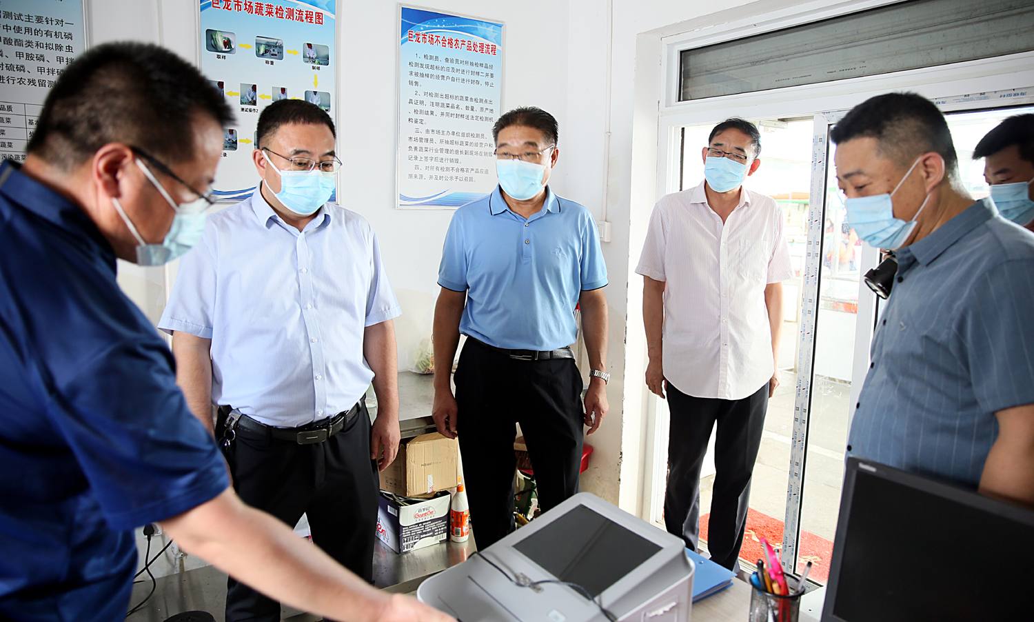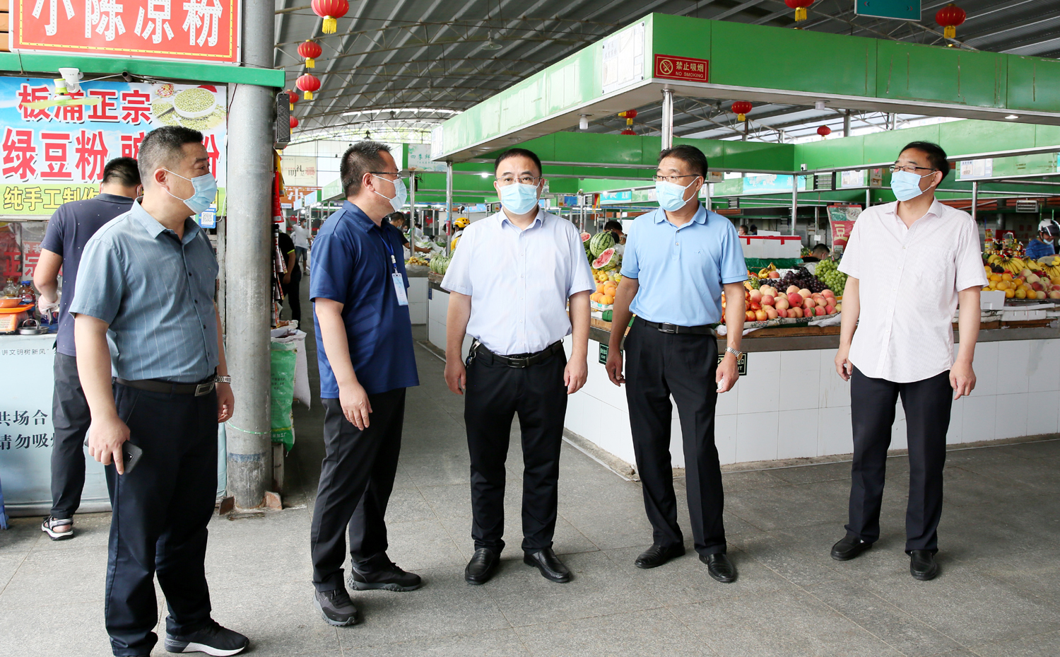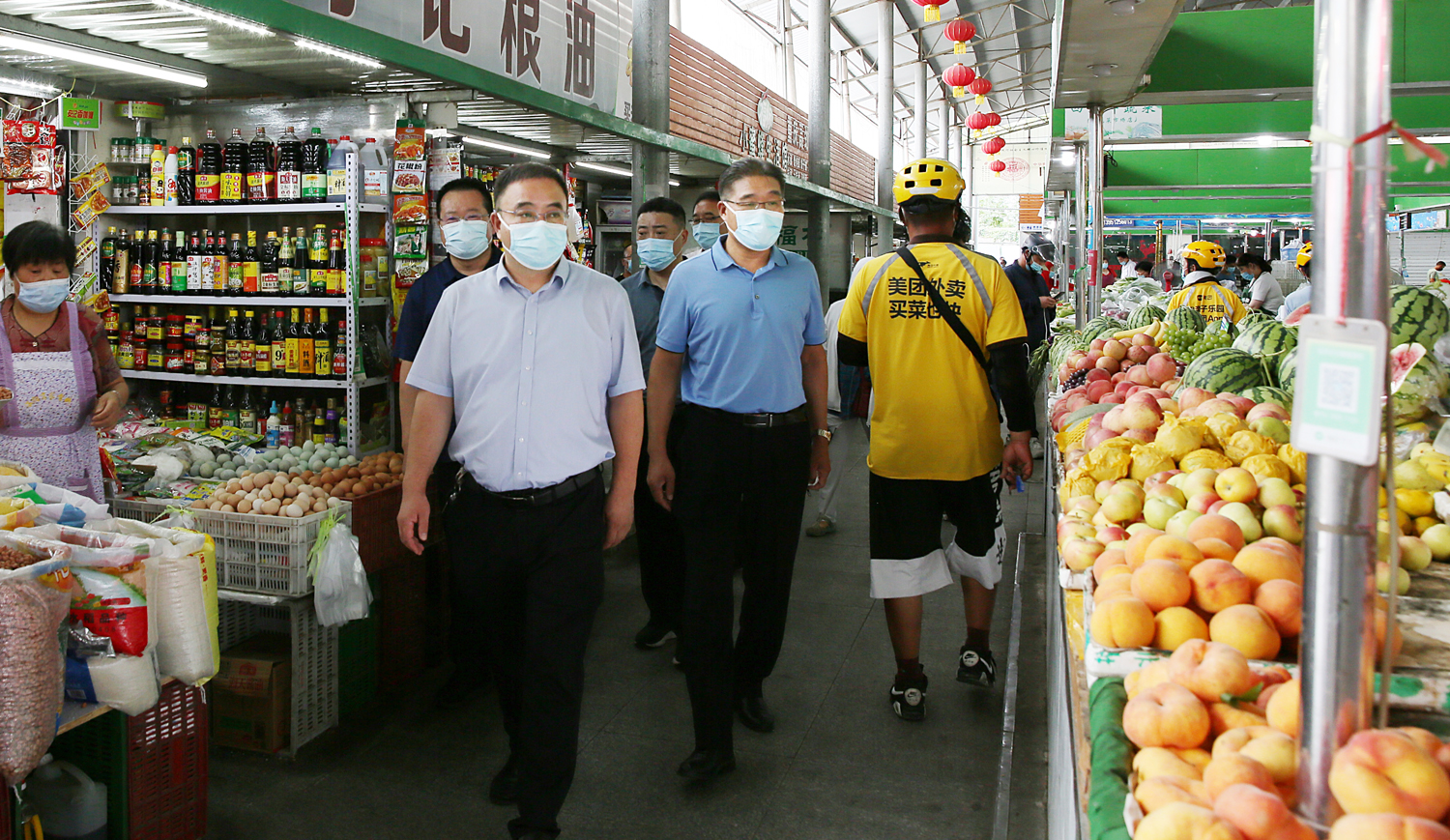 8月5日,集團(tuán)公司黨委書記、董事長、疫情防控領(lǐng)導(dǎo)小組組長楊龍深入巨龍農(nóng)貿(mào)市場督導(dǎo)疫情防控工作。他強(qiáng)調(diào),要深入貫徹中央、省市委疫情防控指示精神,保持疫情防控高壓態(tài)勢,抓實(shí)抓細(xì)抓嚴(yán)各項(xiàng)措施,守護(hù)好市民的“菜藍(lán)子”“米袋子”。集團(tuán)公司工會(huì)主席、疫情防控領(lǐng)導(dǎo)小組辦公室主任劉承志,金航資產(chǎn)經(jīng)營公司相關(guān)負(fù)責(zé)人陪同督導(dǎo)。 楊龍一行按防疫要求完成體溫測量、蘇康碼掃碼后,進(jìn)入市場區(qū)域,認(rèn)真察看市場內(nèi)口罩佩戴、掃碼查驗(yàn)、體溫檢測等基礎(chǔ)防疫措施,仔細(xì)詢問人員管控、防疫消殺等制度落實(shí)情況。查看了解糧油肉蛋奶及水果、蔬菜等重要食品的市場供應(yīng)、保質(zhì)穩(wěn)價(jià)等情況。楊龍指出,農(nóng)貿(mào)市場人員流動(dòng)性大、接觸頻繁,是疫情防控的重要區(qū)域。金航公司要切實(shí)落實(shí)好主體責(zé)任,按照市疫情防控指示精神和集團(tuán)“十排查”“十到位”的要求,嚴(yán)格落實(shí)好各項(xiàng)措施,做好入口人員管理,嚴(yán)格落實(shí)體溫檢測、佩戴口罩、健康碼掃碼等工作,全面落實(shí)環(huán)境清潔消毒。要嚴(yán)把食品安全關(guān),嚴(yán)格履行相關(guān)手續(xù),確保食品流通各環(huán)節(jié)安全可控。要規(guī)范經(jīng)營,確保市場食品供應(yīng)充足、價(jià)格穩(wěn)定、消費(fèi)安全。同時(shí)要積極引導(dǎo)群眾和工作人員做好自我防護(hù),保持良好衛(wèi)生習(xí)慣,倡導(dǎo)健康生活方式。