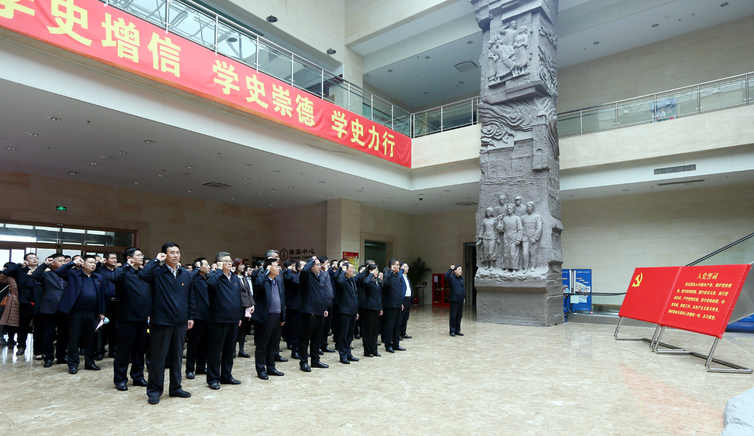 4月22日下午,集團(tuán)公司黨委在市革命紀(jì)念館舉辦“學(xué)史明理守初心、砥礪奮進(jìn)擔(dān)使命”黨性教育實(shí)境課堂。集團(tuán)黨委班子成員,各單位黨建、紀(jì)檢、工會(huì)分管領(lǐng)導(dǎo)、黨群工作部(學(xué)教辦)負(fù)責(zé)人,集團(tuán)總部助理以上管理人員80余人參加。 走進(jìn)市革命紀(jì)念館,在鮮紅的黨旗下,全體黨員舉起右拳,重溫入黨誓詞,鏗鏘有力的誓詞,進(jìn)一步激發(fā)黨員干部牢記黨的初心和使命。在紀(jì)念館展室,大家認(rèn)真看、仔細(xì)聽(tīng),通過(guò)歷史文獻(xiàn)、革命文物、新聞圖片和視頻資料,真切感受到中國(guó)共產(chǎn)黨領(lǐng)導(dǎo)海屬地區(qū)人民在五四運(yùn)動(dòng)、土地革命、抗日戰(zhàn)爭(zhēng)、解放戰(zhàn)爭(zhēng)時(shí)期血與火的革命斗爭(zhēng)史。