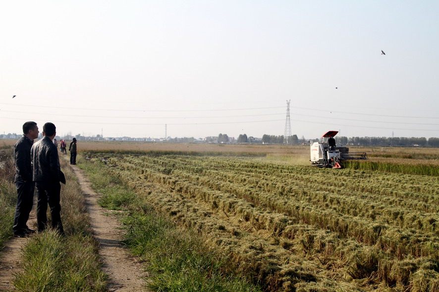 11月1日下午,連陰后地放睛氣溫明顯回升,鹽田稻花香,稻谷歸曬場,銷售訂單忙。在青口公司大新農(nóng)場的一分場趙斯凱的條田,兩臺收割機(jī)來回穿梭,一片繁忙的景象,全公司近二萬畝水稻開始收割。