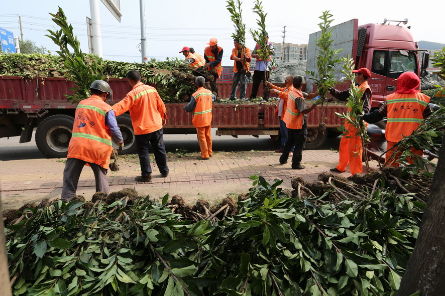 新光路鐵路橋至港城大道段南側(cè)綠化帶,因為人為踩踏、車輛碾壓導(dǎo)致綠化斑禿損壞嚴(yán)重,為盡快恢復(fù)綠化原貌,改善市容市貌。8月18日,裕升、裕欣養(yǎng)護公司組織80多名綠化工,從早上6點一直干到下午6點,卸苗、運苗、挖坑、插苗,烈日酷暑下奮戰(zhàn)一整天,中午在樹陰下吃點盒飯,喝點礦泉水,繼續(xù)工作,橘黃色工作被汗水浸透、被烈日烤干,這樣有好幾個來回。“今天我們要在這片綠化補植紅葉石楠、金森女貞等模紋小苗1萬余株,紅葉石楠球等灌木110株,有效改善該路段綠化植被,提升城市形象,我們還要在黃海續(xù)道補植草坪近30000平方,在這條1000多米長的路段,有車輛維修點50多家,車輛出入,對路邊綠化帶傷害非常大,這一路段也是環(huán)衛(wèi)整治長期存在的‘老大難’,這次,在開發(fā)區(qū)行政執(zhí)法部門的配合下,我們要重新種植草坪,對這一‘老大難’路段植被進行恢復(fù),另外德蘭南路、東路補植苗木近80萬元的綠化工程也已開工上土整土,接著要栽苗,根據(jù)開發(fā)區(qū)創(chuàng)衛(wèi)部署要求,上述這些事情必須在8月底完成,所以說時間相當(dāng)緊,職工們都冒著高溫,加班加點搶進度?!惫靖笨偨?jīng)理郁宏峰說。