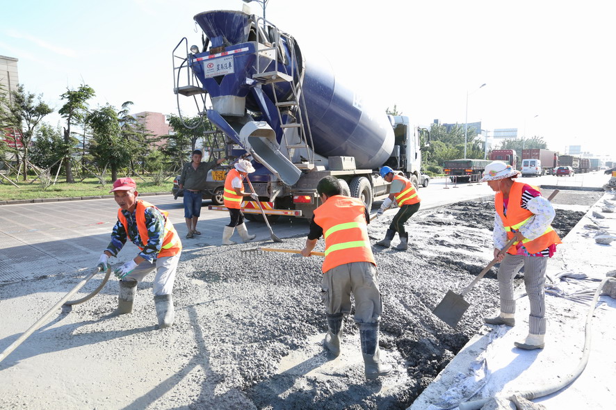 在大港路“新光路至零公里”路段,筆者在水泥路上看到一塊塊被切割成方方正正的凹面,四周都架好防護欄等安全防護設(shè)施,在華東城北門偏東不遠(yuǎn)處,一臺挖掘機的鏟斗被換上沖擊破碎錘,正在一大塊破損的水泥路面沖擊破碎作業(yè),“嗒嗒嗒”的沖擊聲十分震耳。在與現(xiàn)場作業(yè)的盛達市政公司市政維修項目部副主任史如勤交流中得知,該路段是附近集團箱基站進出港口集裝箱車輛的重要通道,每天有好幾百輛集裝箱車輛進出,水泥路面不堪重負(fù),損壞比較嚴(yán)重,根據(jù)開發(fā)區(qū)創(chuàng)衛(wèi)工作要求,由他們對該路段破損處進行局面分割維修,整個路段維修面積達到5000多平方,為保證道路使用通行,采取半幅維修、邊破碎邊澆灌的方式,保證施工進度,現(xiàn)正在維修北側(cè)路面,整個路面維修計劃在8月底完成?!耙驗閯?chuàng)衛(wèi),我們下一步還要對轄區(qū)內(nèi)的破損、歪到的路牙石進行維修扶正,242路段瀝青破損路面維護,還要開通四處道口,而現(xiàn)在事多人少,人手比較緊張,我們周六周日都沒有休息,就是想把創(chuàng)衛(wèi)工作任務(wù)一項一項地及時完成,決不能拖創(chuàng)衛(wèi)工作后腿?!彼呎f邊用肩上的毛巾擦著額頭上的汗水。