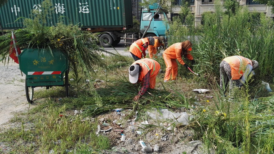 在昌圩湖環(huán)湖路南側(cè)一處公共廁所處,裕升養(yǎng)護公司20多名環(huán)衛(wèi)保潔工人正在清理公廁周邊的雜草、建筑垃圾,有的在割草、有的在搬磚、有的在推車,一個個汗流浹背,忙得不亦樂乎。正在現(xiàn)場忙碌的保潔大隊長劉保軍對筆者說:“這一塊段還沒有交給我們養(yǎng)護,一直無人管理,雜草叢生,成為建筑、裝修垃圾的堆放地,根據(jù)開發(fā)區(qū)創(chuàng)衛(wèi)環(huán)境衛(wèi)生無死角要求和華茂公司生產(chǎn)技術(shù)部門指令,我們裕升養(yǎng)護公司承擔(dān)這一區(qū)域環(huán)境衛(wèi)生突擊整治任務(wù),從綠化保潔班組抽調(diào)20多人來搞突擊,大家面對天氣炎熱、工作量大、清理困難等因素,發(fā)揚不怕吃苦、敢打硬仗的華茂精神,奮戰(zhàn)在突擊現(xiàn)場,每個人都汗流不止,工作服全被汗水浸透,昨天我們已在這里整整干了一天,由于垃圾量大、雜草面積大,我們動用了裝載機等機械設(shè)備,運雜草的三輪車跑近百趟,清理建筑、裝修等垃圾數(shù)十噸。估計今天下午能夠全部結(jié)束。”