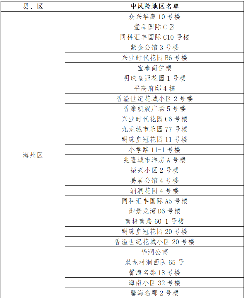 根據(jù)國(guó)務(wù)院聯(lián)防聯(lián)控機(jī)制有關(guān)規(guī)定,經(jīng)市指揮部研究決定,自發(fā)布之日起,對(duì)我市部分區(qū)域疫情風(fēng)險(xiǎn)等級(jí)進(jìn)行調(diào)整:海州區(qū)天順國(guó)際花園7號(hào)樓、鳳凰名都10號(hào)樓、御景龍灣C1號(hào)樓、天順國(guó)際花園11號(hào)樓、御景龍灣A4號(hào)樓、香溢江南小區(qū)12號(hào)樓、同科匯豐國(guó)際A2號(hào)樓、平高書(shū)香名邸1號(hào)樓、香溢江南小區(qū)7號(hào)樓、西門(mén)村楊鳳莊21號(hào)、鳳凰名都9號(hào)樓、園林村白虎山小區(qū)78號(hào)樓、江化北路82-5號(hào)、金色大漠、平高書(shū)香名邸4號(hào)樓、朐陽(yáng)街道花園路1號(hào)、制藥巷5-114、萬(wàn)潤(rùn)泰和苑4號(hào)樓由中風(fēng)險(xiǎn)地區(qū)調(diào)整為低風(fēng)險(xiǎn)地區(qū)。其他地區(qū)風(fēng)險(xiǎn)等級(jí)不變。調(diào)整后全市現(xiàn)有28個(gè)中風(fēng)險(xiǎn)地區(qū)。