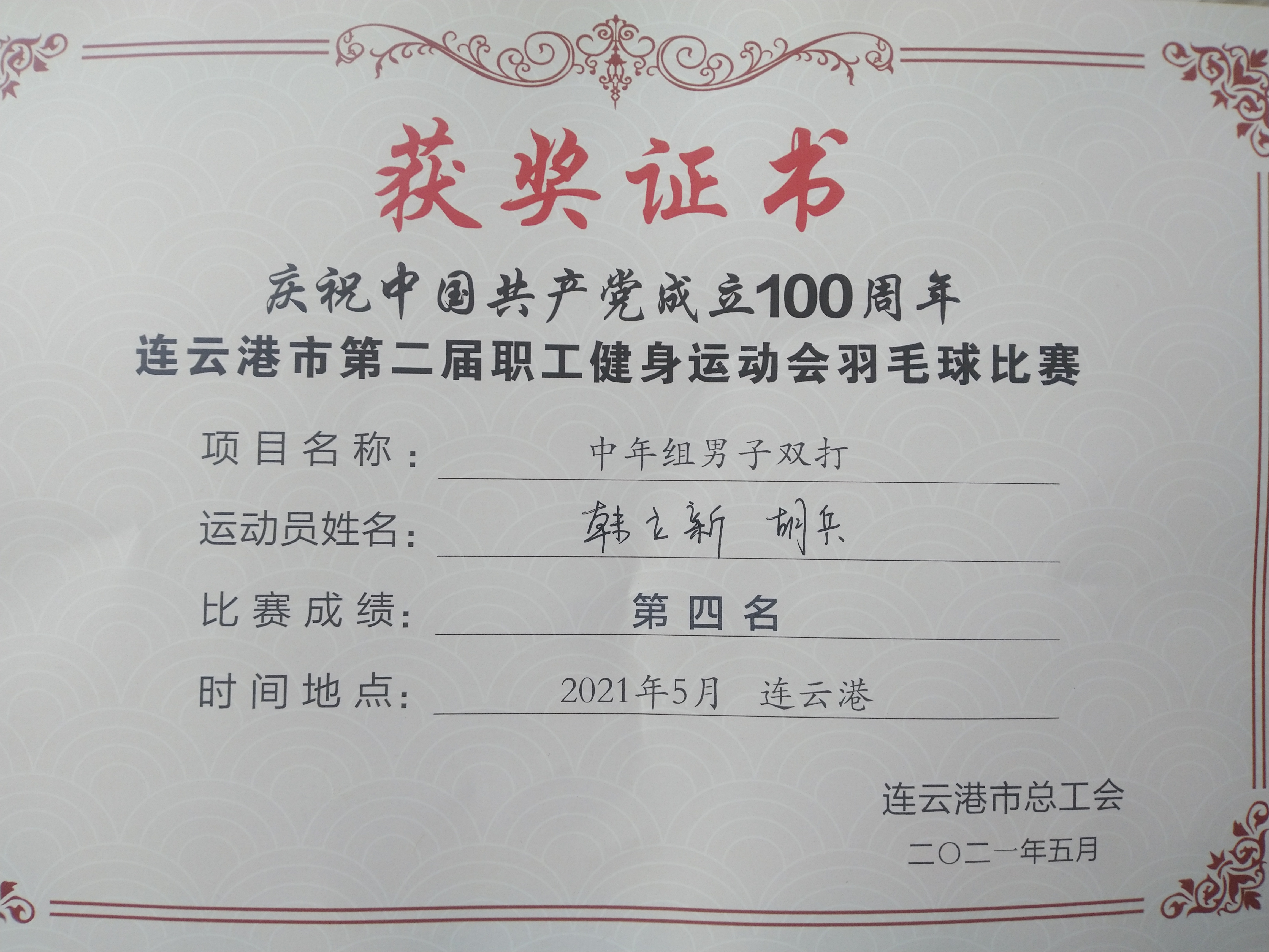 5月28-29日,市第二屆職工健身運(yùn)動(dòng)會(huì)羽毛球比賽在振興李寧羽毛球館舉辦,來自全市34支代表隊(duì),293名選手參賽。經(jīng)過激烈角逐,韓立新、胡兵在中年男子雙打比賽中取得了第四名的好成績(jī)。