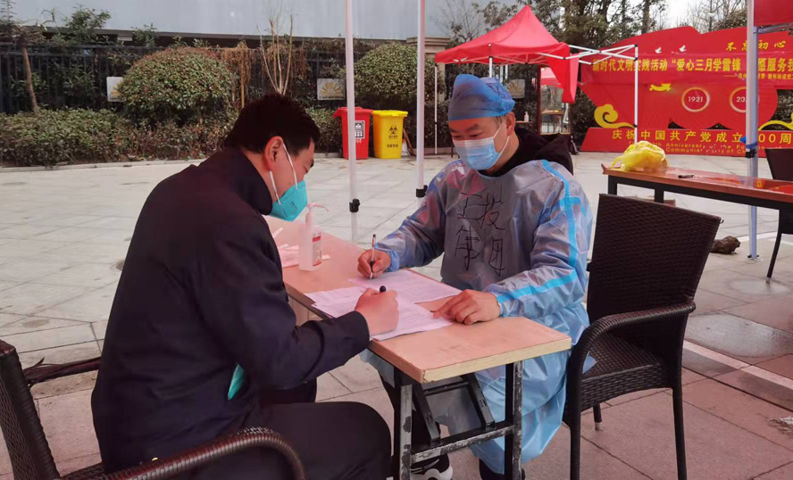 在該小區(qū)核酸檢測點(diǎn),一名身穿防護(hù)服的男生也引起了大家的注意,在整齊的隊(duì)伍旁邊,他忙碌地來來去去,一會兒維持秩序,一會兒將行動不便的老年人引導(dǎo)到綠色通道前,忙得不亦樂乎。這位小伙子叫袁晨,是上元公司的一位預(yù)備黨員,當(dāng)居民問到他累不累時,他笑了笑:“我是一名青年,那些醫(yī)護(hù)人員和社區(qū)工作者才辛苦。我覺得,穿上防護(hù)服的那一刻,我仿佛也成為了一名白衣天使,雖不及醫(yī)護(hù)人員那么偉大,但做著自己力所能及的事,為疫情防控貢獻(xiàn)一份力量,我發(fā)自內(nèi)心的快樂,渾身也充滿力量。”