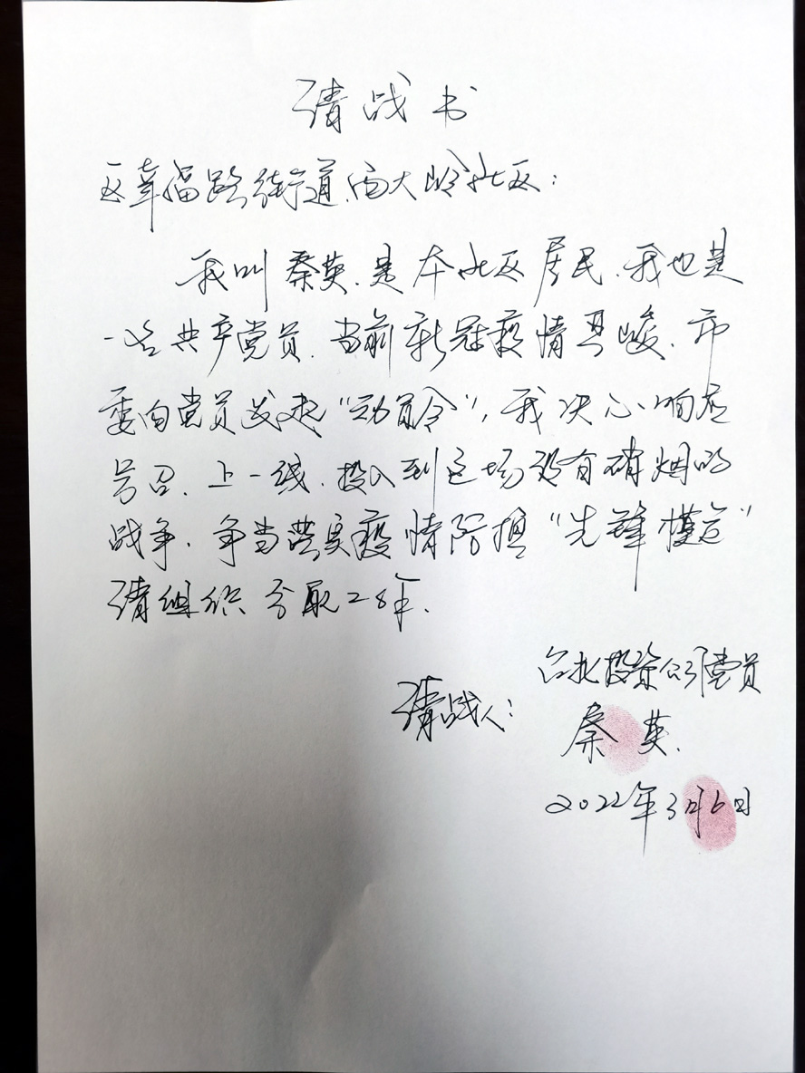 隨著市政府的快速響應(yīng),不到中午就開始全區(qū)核酸檢測,突地一下工作人員不夠用了。“疫情就是命令,防控就是責任”,秦英主動聯(lián)系海州區(qū)幸福路街道西大嶺社區(qū),在咨詢志愿者報名的同時,鄭重地并向社區(qū)遞交了一份疫情防控“請戰(zhàn)書”。與此同時,她還動員她所在的“工投舞蹈隊”一幫姐妹,迅速成立一支抗疫志愿者隊伍,自發(fā)維護小區(qū)防控秩序,參與小區(qū)噴灑消毒、衛(wèi)生清掃、鄰居物資代購、心理疏導(dǎo)等工作中。幾千人的小區(qū)在她的感染帶動下,擰成一股繩、攥成一個拳,群防群控,筑起一道廣泛堅實的防疫戰(zhàn)線。
