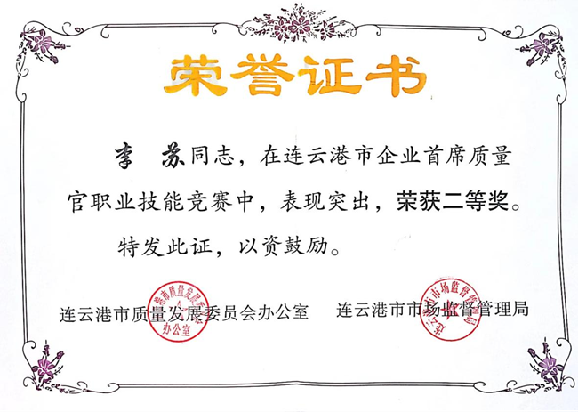 為貫徹落實(shí)省委政府《江蘇省質(zhì)量提升行動(dòng)實(shí)施方案》精神,進(jìn)一步推動(dòng)連云港市企業(yè)高質(zhì)量發(fā)展,市質(zhì)量發(fā)展委員會(huì)辦公室和市市場監(jiān)督局聯(lián)合與6月份舉辦了2022年連云港市企業(yè)首席質(zhì)量官職業(yè)技能競賽。氨綸公司代表李蘇同志發(fā)揚(yáng)勇于拼搏、不驕不躁的競賽精神,獲得了此次競賽二等獎(jiǎng)。