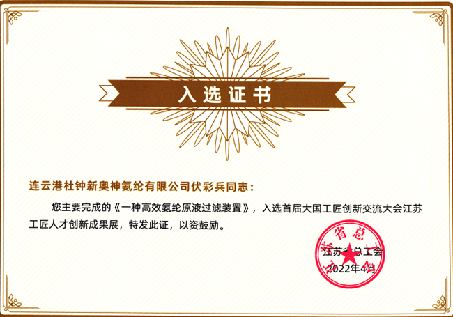 根據(jù)省、市總工會部署要求,氨綸公司積極組織工匠人才參展。經(jīng)評選,公司伏彩兵主要完成的《一種高效氨綸原液過濾裝置》創(chuàng)新成果入選大國工匠展,伏彩兵還入選了首屆大國工匠創(chuàng)新交流大會江蘇展區(qū)重點(diǎn)展示科創(chuàng)推薦通道。