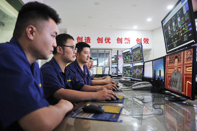 生產(chǎn)一部員工在操作現(xiàn)場觀看慶祝大會。