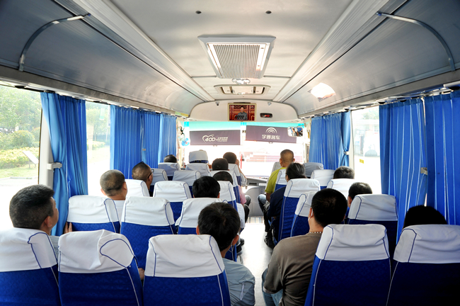 運(yùn)轉(zhuǎn)班員工在通勤車上觀看慶祝大會。