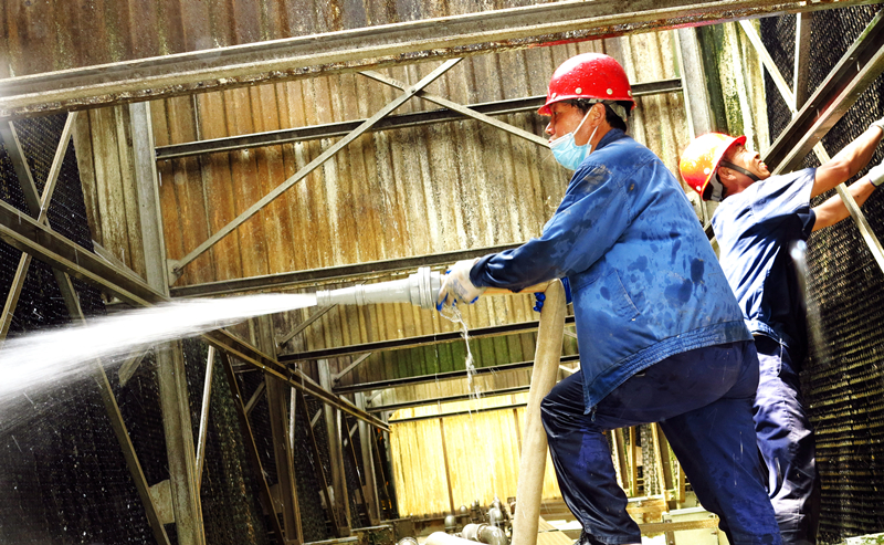 近期,最高氣溫達(dá)到了36℃!公用工程部一直密切關(guān)注近一周的天氣預(yù)報(bào),利用連續(xù)高溫天氣回調(diào)之際,迅速組織相關(guān)清洗人員,利用一天時(shí)間緊急清洗八期冷卻塔,將附著在填料上藻狀和絮狀物及塔底淤泥等徹底清理干凈,從而保證冷卻塔通風(fēng)量,使八期動(dòng)力設(shè)備得以在高溫環(huán)境下安全運(yùn)行,接受“烤驗(yàn)”。