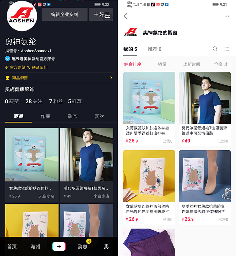 5月20日,氨綸公司經(jīng)過幾個(gè)月的緊張籌備,“奧旎服飾”在抖音、淘寶正式上線。這標(biāo)志著氨綸公司正式開啟了電商銷售后道產(chǎn)品的新時(shí)代。