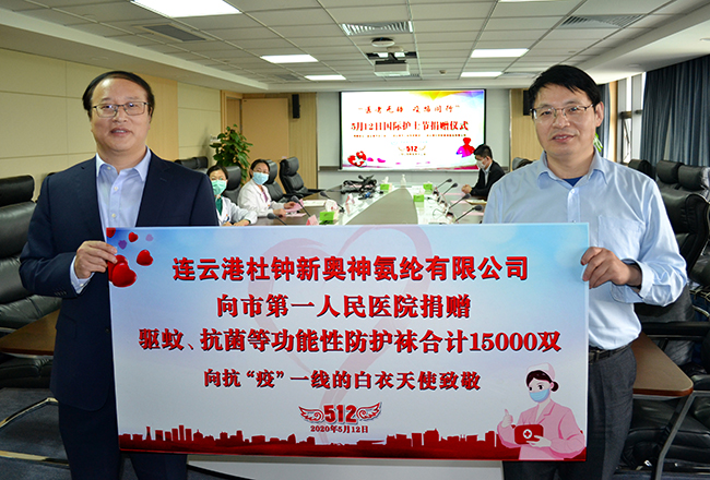 5月12日,連云港杜鐘氨綸有限公司在市總工會的帶領(lǐng)下來到連云港市第一人民醫(yī)院開展愛心捐贈活動。氨綸公司與國內(nèi)知名襪業(yè)公司俏佳人合作使用奧神專利產(chǎn)品訂制了一批“防脫散襪”、驅(qū)蚊襪、抗菌防臭襪等功能性防護(hù)襪,共計捐贈15000雙。市總工會副主席、女職委主任秦云;連云港市工業(yè)投資集團(tuán)工會主席劉承志;市第一人民醫(yī)院副院長、工會主席胡蓉,副院長李明星;連云港杜鐘新奧神氨綸有限公司總經(jīng)理張斌,副總經(jīng)理劉明珠等領(lǐng)導(dǎo)出席捐贈儀式。