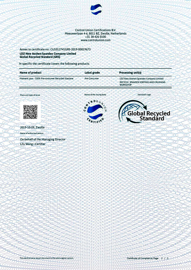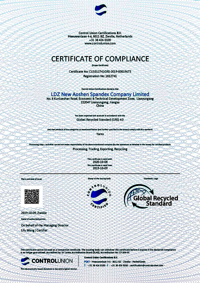 2019年10月9日,連云港杜鐘新奧神氨綸有限公司通過全球回收標準認證,取得GRS證書,即獲得對再生氨綸纖維生產(chǎn)的資質(zhì),可根據(jù)客戶需要提供貿(mào)易證書(TC)和全球認可的GRS吊牌。