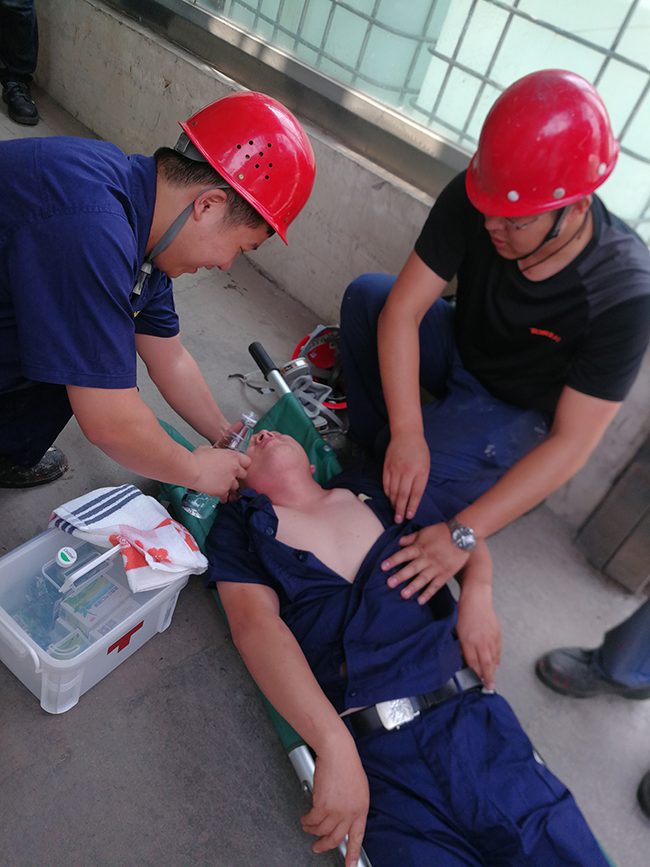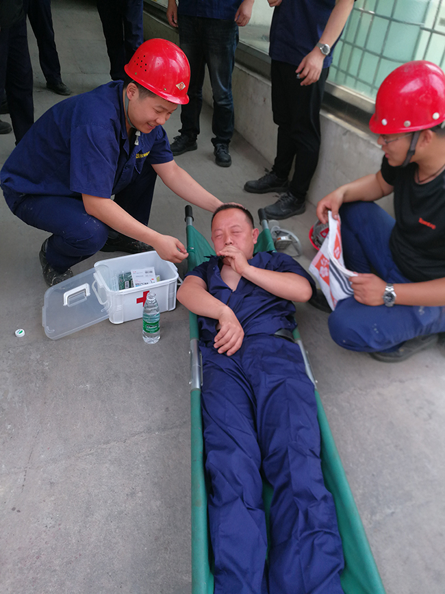 為了檢驗我公司職業(yè)危害救援組織反應(yīng)速度、救援能力以及協(xié)同配合、演練救援技能,氨綸公司于2019年6月12日10:00組織一次職業(yè)病應(yīng)急預(yù)案演練,演練隊伍針對一名員工發(fā)生高溫中暑危害開展應(yīng)急救援演練。