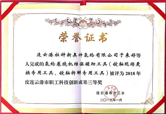 氨綸公司生產(chǎn)設(shè)備部卷繞機維修班組于來好同志發(fā)明的氨綸卷繞機維保輔助工具(其中錠軸現(xiàn)場更換專用工具和錠軸拆解專用工具)被市總工會評為“2018年度連云港職工科技創(chuàng)新成果三等獎。”
