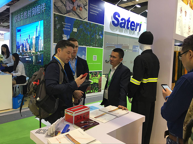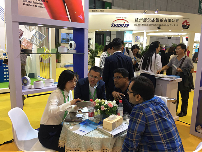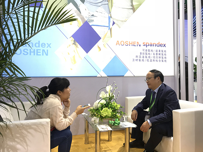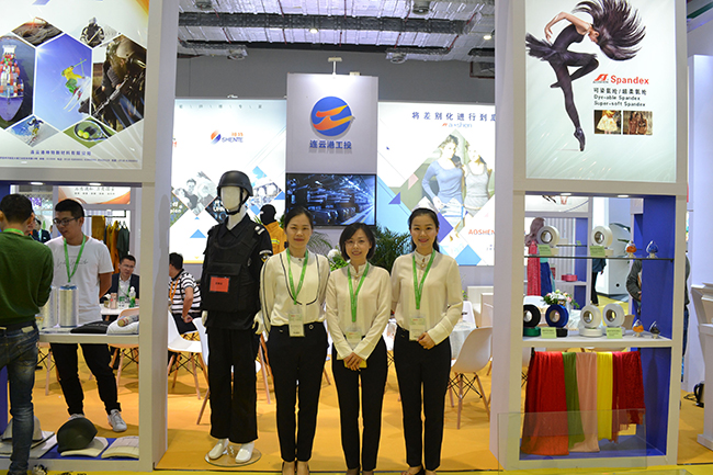 展覽會(huì)上,化纖協(xié)會(huì)王會(huì)長帶領(lǐng)的貴賓參觀團(tuán)一行親臨我公司展位進(jìn)行參觀交流。其他前來咨詢、洽談業(yè)務(wù)的國內(nèi)外客商絡(luò)繹不絕,氨綸公司的8大系列產(chǎn)品成為大家關(guān)注的焦點(diǎn),來自孟加拉、印度、土耳其、日本等國家的客商紛紛表達(dá)了與公司深入合作的強(qiáng)烈意向,大家特別對(duì)公司新品石墨烯氨綸、低溫?zé)嵴澈习本]等產(chǎn)生了濃厚的興趣。展覽會(huì)上,氨綸公司總經(jīng)理張斌接受了化纖協(xié)會(huì)和紡織報(bào)的專題采訪,張總詳細(xì)介紹了公司大力實(shí)施差別化戰(zhàn)略,在引領(lǐng)氨綸行業(yè)流行趨勢過程中,重視新品研發(fā)、品質(zhì)保證、品牌打造方面的生動(dòng)實(shí)踐。神特新材和奧神新材分別展示了超高分子量聚乙烯纖維防彈系列產(chǎn)品和聚酰亞胺防火耐高溫系列產(chǎn)品,廣大客商紛紛駐足參觀,垂詢交流。