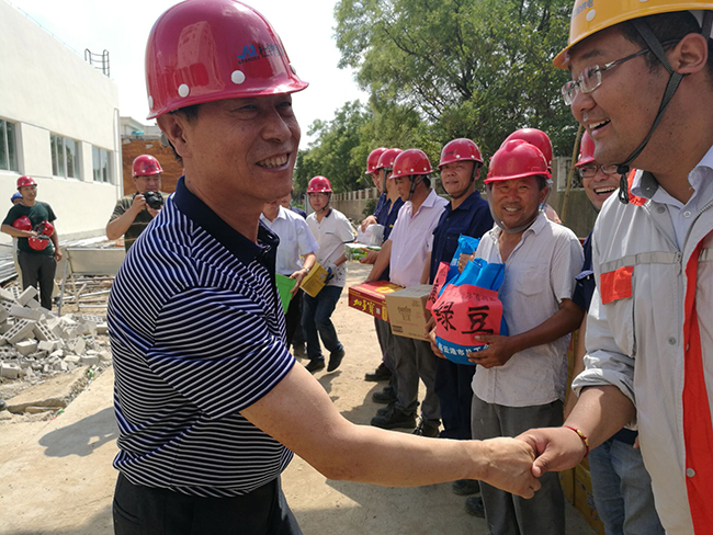 朱斌與工地現(xiàn)場(chǎng)員工逐一握手,并表示:“八期項(xiàng)目職工們幾乎天天都在高溫下奮戰(zhàn),不僅辛苦還有中暑的可能,我們工會(huì)組織希望能為大家提供一點(diǎn)幫助,讓大家能夠在炎炎夏日感受到一絲清涼,進(jìn)而更好地開(kāi)展工作”。