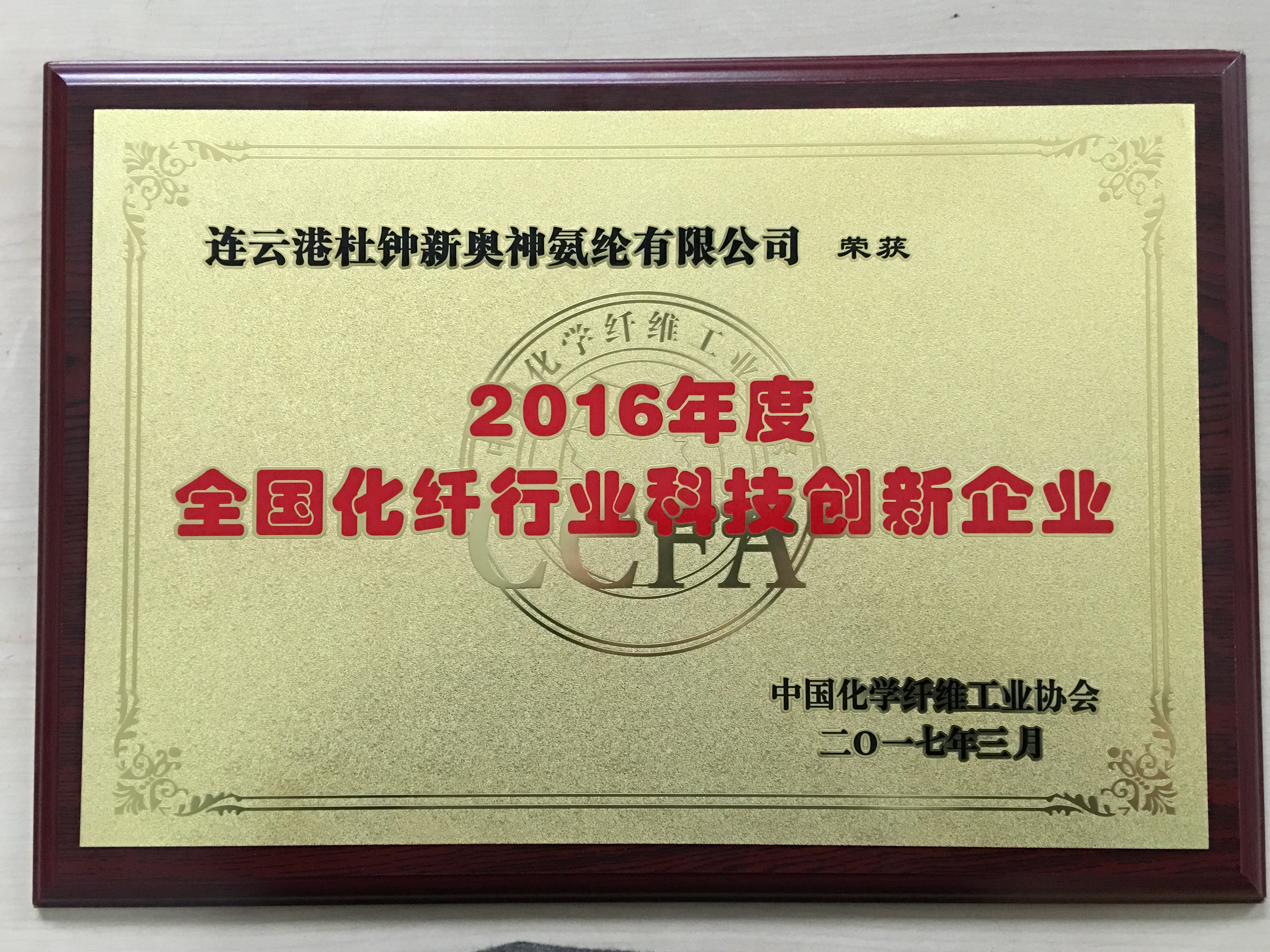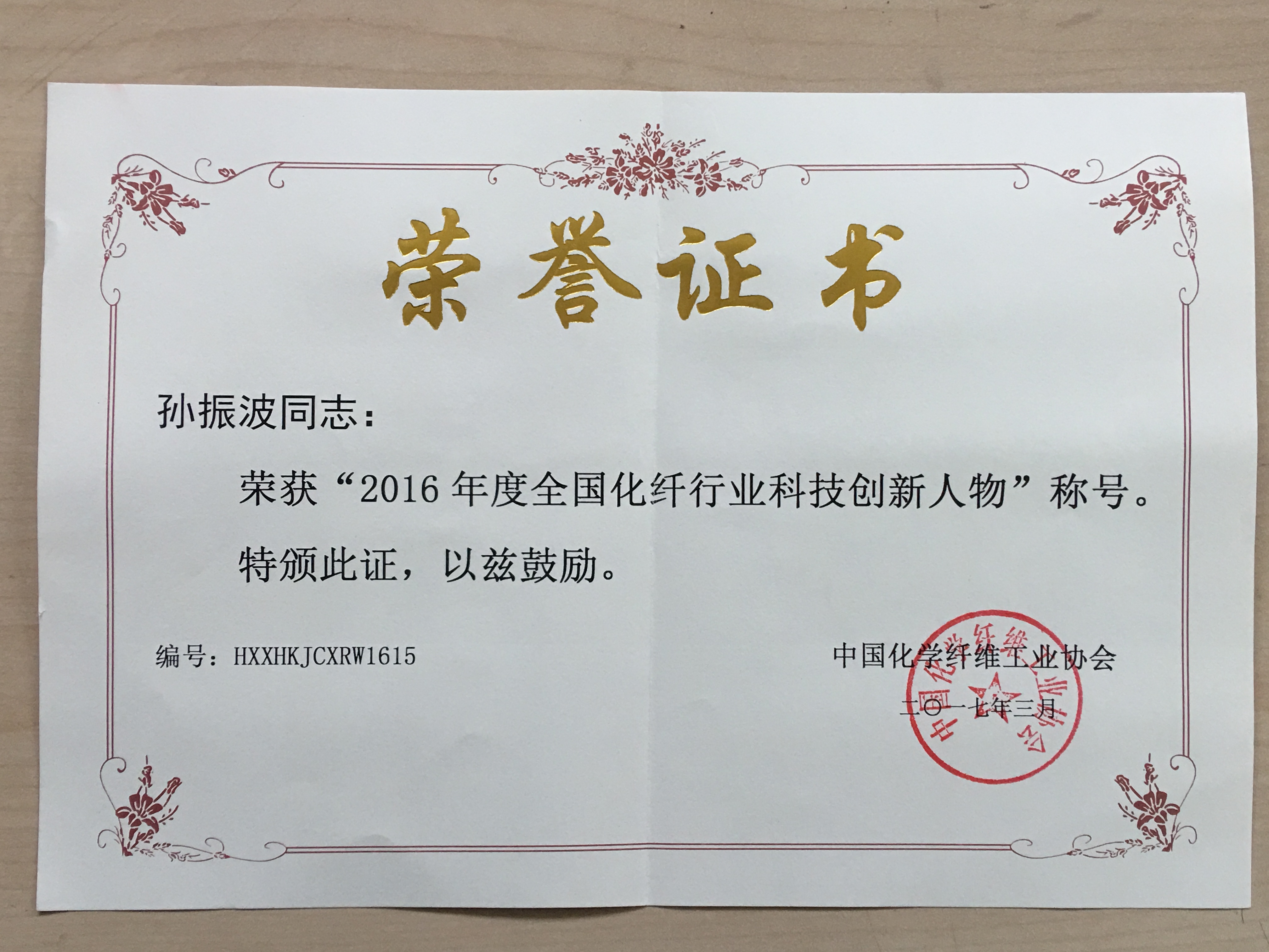 中國化學纖維工業(yè)協(xié)會第六屆第三次理事會暨中國化纖行業(yè)創(chuàng)新發(fā)展論壇于3月14日—15日在上海虹橋賓館召開。我公司獲“2016年度全國化纖行業(yè)科技創(chuàng)新示范企業(yè)”、孫振波獲”2016年度全國化纖行業(yè)科技創(chuàng)新人物“榮譽稱號。