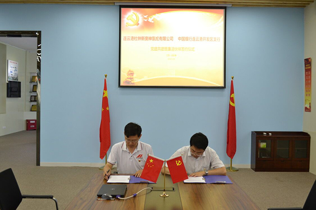 6月29日上午,杜鐘氨綸公司與中行連云港開發(fā)區(qū)支行舉行黨建共建及廉潔伙伴協(xié)議簽約儀式。儀式上,中行連云港開發(fā)區(qū)支行行長介紹了分行的基本情況、經(jīng)營管理情況、黨建和黨風(fēng)廉政建設(shè)情況。