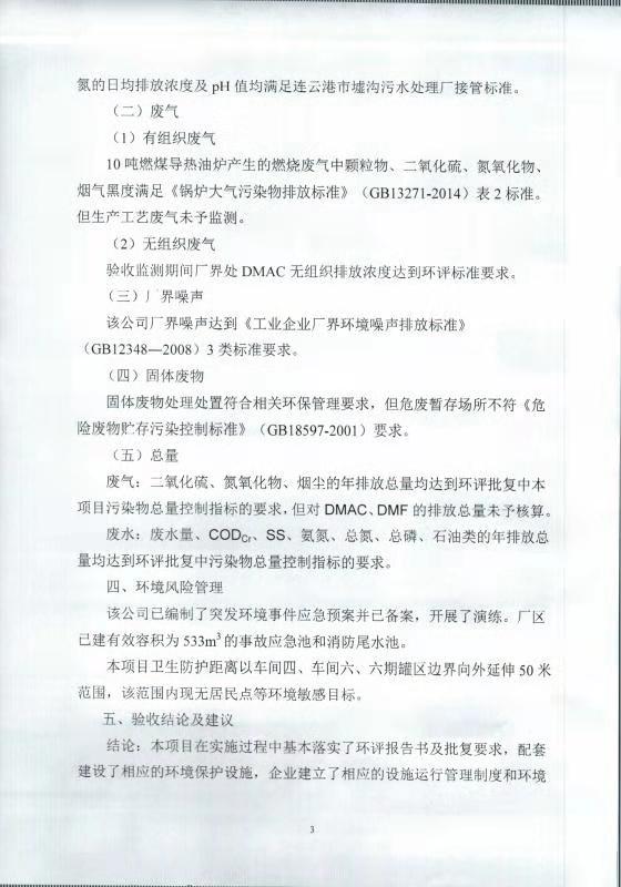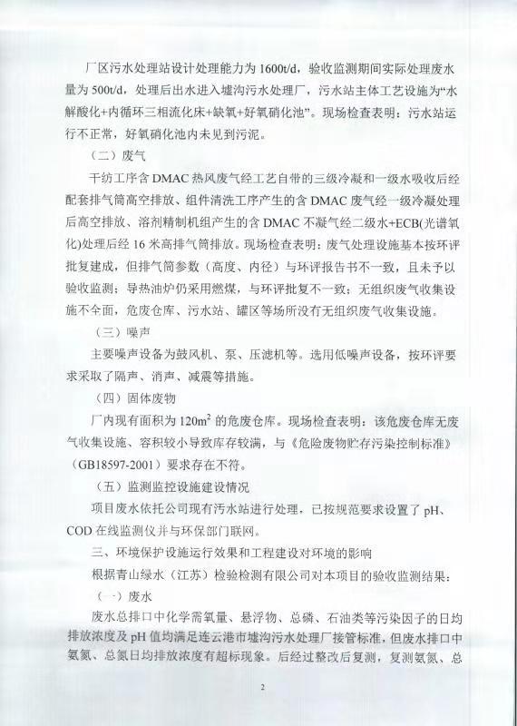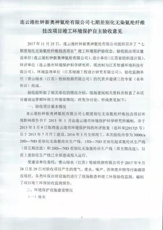 七期差別化無(wú)染氨綸纖維技改項(xiàng)目竣工環(huán)境保護(hù)自主驗(yàn)收意見(jiàn)