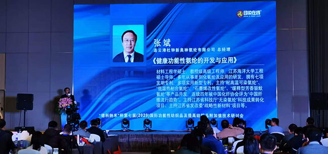 12月4日,由印染在線主辦的“乘風(fēng)破浪·智匯紡織”第七屆(2020)國(guó)際功能性紡織品及提高紡織品附加值技術(shù)研討會(huì)在杭州舉行。公司總經(jīng)理張斌帶隊(duì)參加了本次大會(huì),并做了題為《健康功能性氨綸的開發(fā)和應(yīng)用》的報(bào)告。