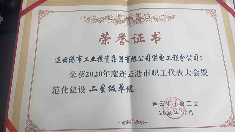 近日,供電公司榮獲市總工會(huì)頒布的2020年度連云港市職工代表大會(huì)規(guī)范化建設(shè)二星級(jí)單位。