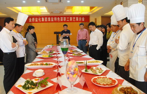 5月19日上午,金橋鹽化集團淮鹽特色菜職工廚藝展示會在淮鹽大酒店隆重舉辦。公司黨委副書記、紀委書記、工會主席盧明生致歡迎詞,集團公司工會副主席李嵐芹宣布比賽開始。來自集團公司各基層單位的13名技藝精湛的廚師做出了26道特色佳肴,經(jīng)過評委會認真品評,臺南鹽場王樹偉、青口鹽場盧燕獲一等獎,其他選手分獲二、三等獎。(司宣)