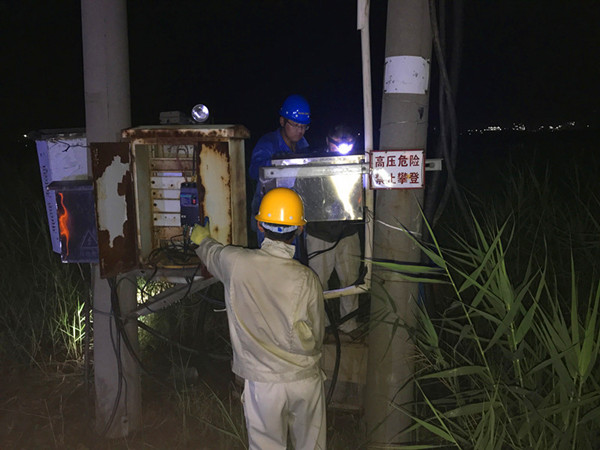 7月30日晚,臺(tái)南供電所員工在蒿西養(yǎng)殖區(qū)緊急處理由于過負(fù)荷導(dǎo)致的配電箱電表線路故障。入伏以來(lái),連云港氣溫居高不下,電網(wǎng)負(fù)荷持續(xù)走高,7月30日晚21點(diǎn),由于用電負(fù)荷突增,蒿西養(yǎng)殖區(qū)發(fā)生配電箱電表線路故障,接到報(bào)修電話后,該所值班工作人員迅速備件,冒著高溫、悶濕的條件下進(jìn)行緊急搶修。圖為工作人員正在安裝配電箱電表接線。此次新招2名實(shí)習(xí)員工也參加了該項(xiàng)搶修任務(wù)。截止當(dāng)晚11時(shí)蒿西養(yǎng)殖區(qū)及其周邊已送電成功。