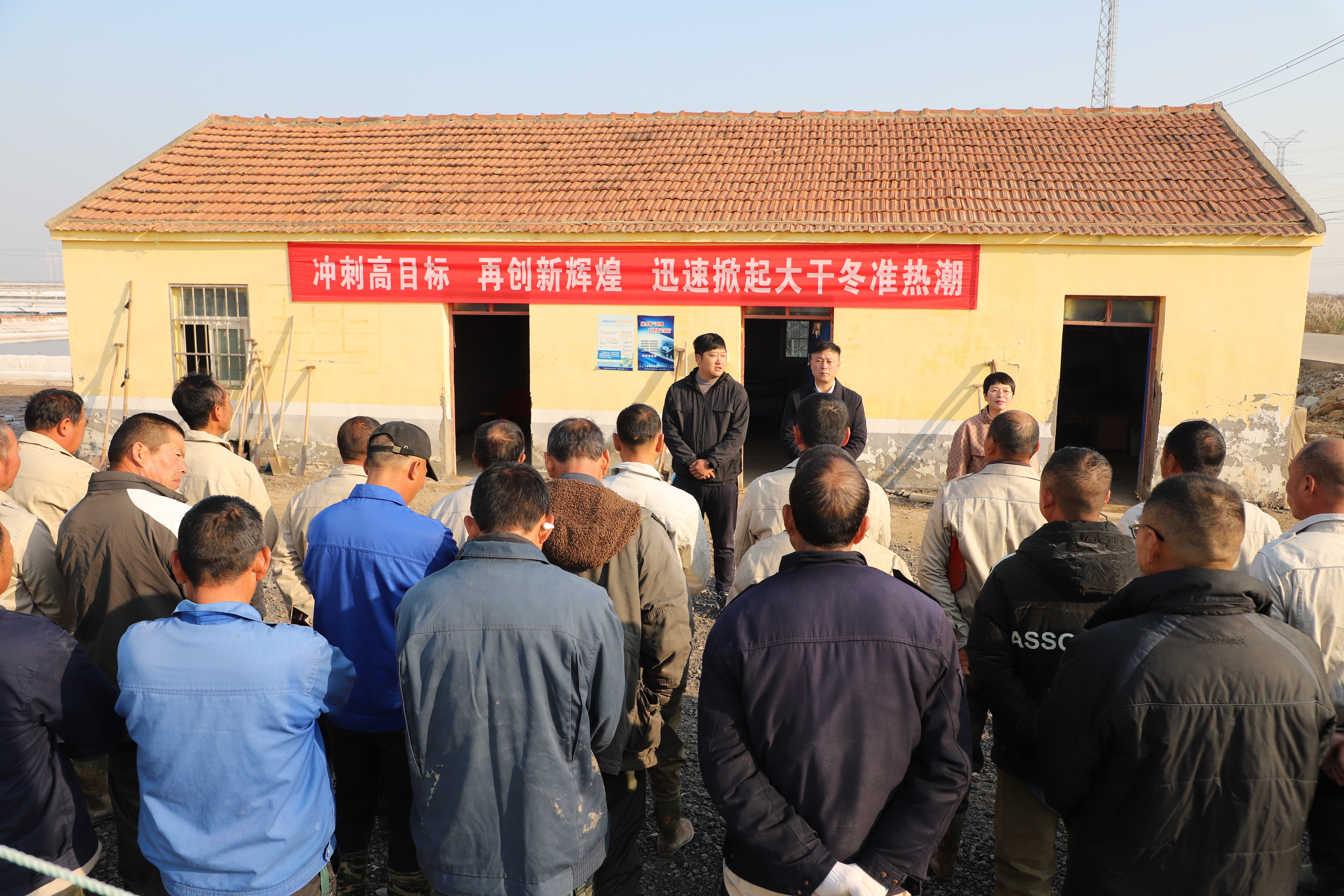 在新河制鹽分公司12班灘頭,常務(wù)副總經(jīng)理徐一林對冬準工作提出要求,總經(jīng)理吳衛(wèi)平宣布“‘薪火灌筑 匠星西傳’師徒結(jié)對擂臺賽”正式開始!