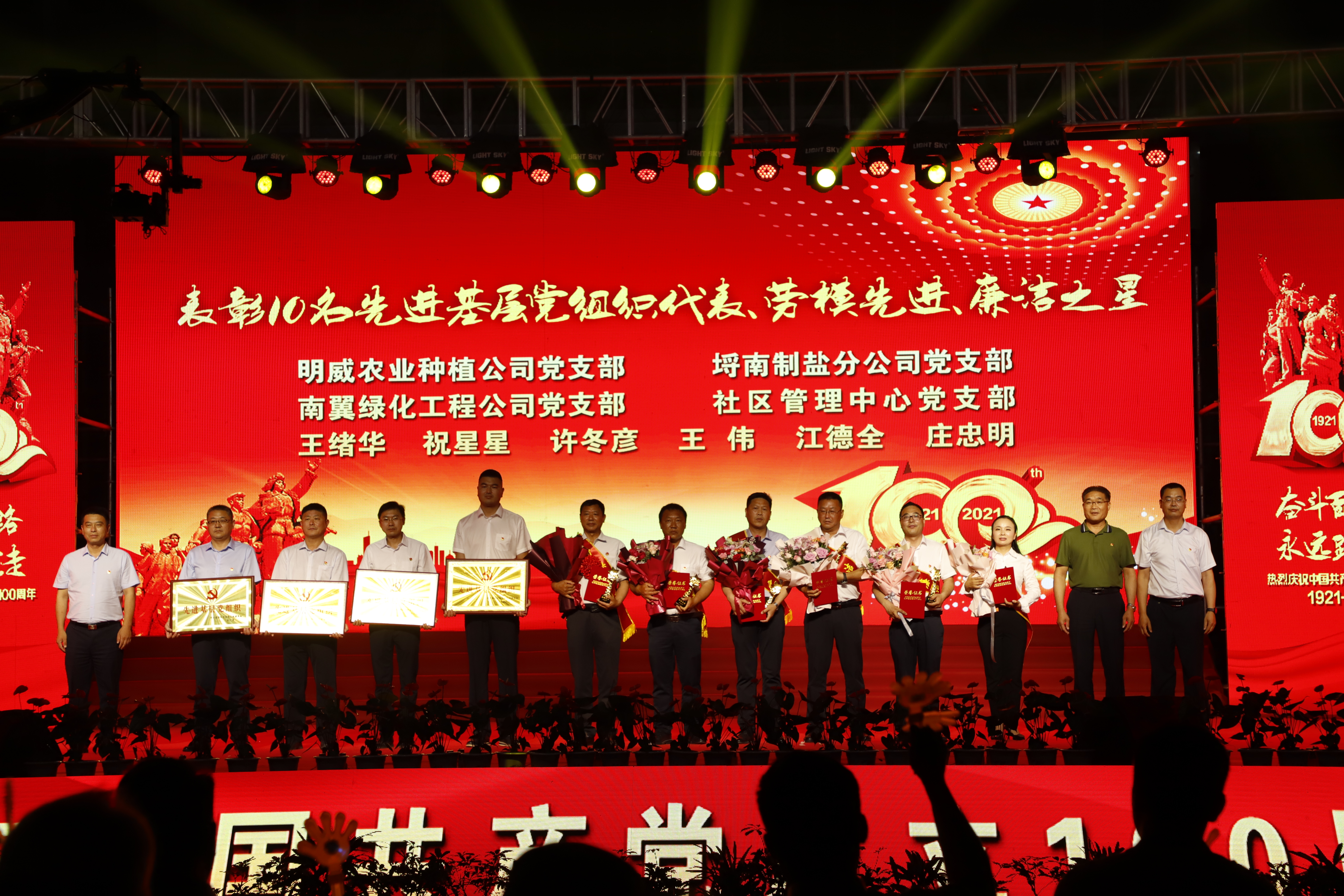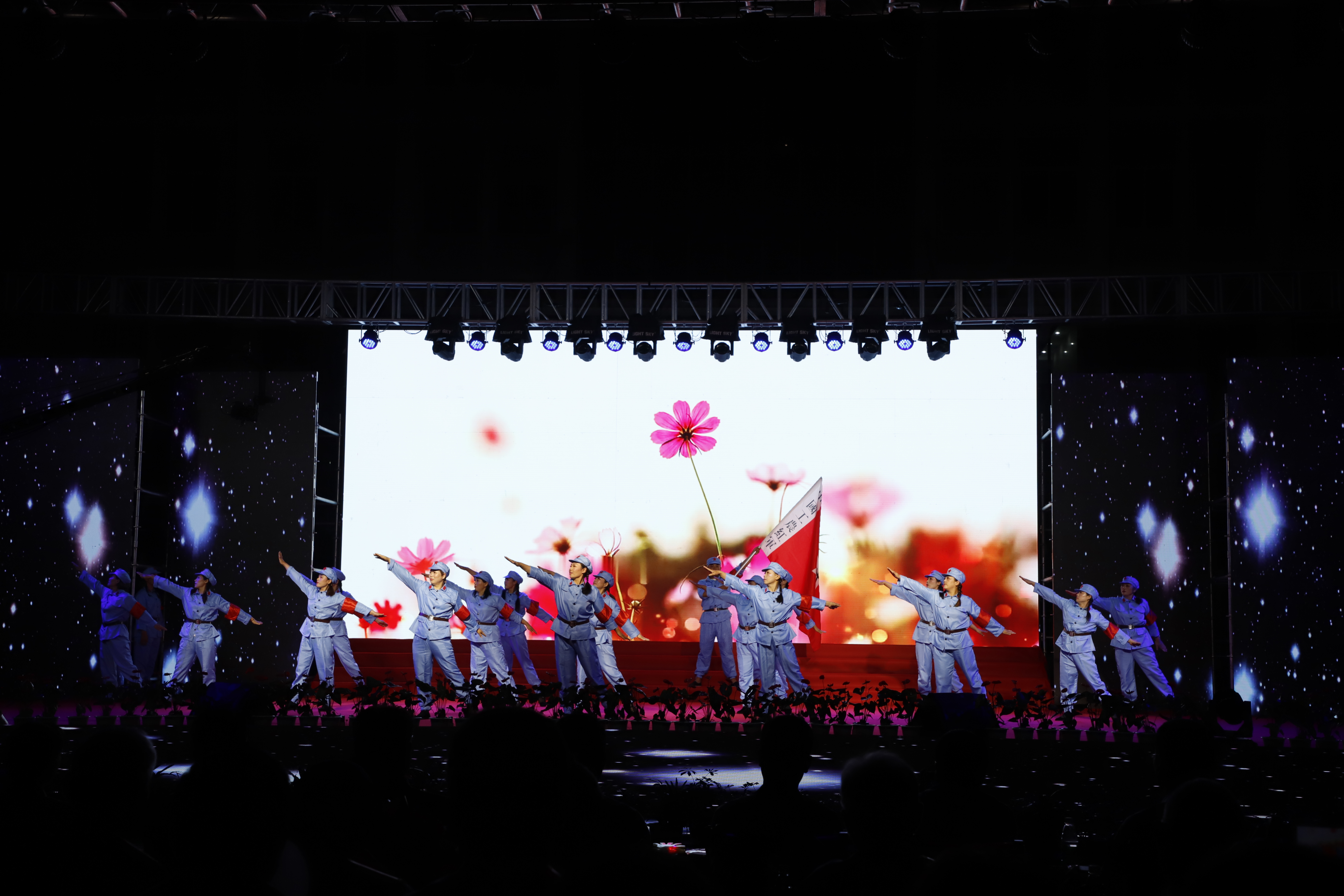 百年征程路漫漫,燦爛輝煌激人心,是中國共產(chǎn)黨指給了人民解放的道路,領(lǐng)導(dǎo)中國走向光明,是中國共產(chǎn)黨引領(lǐng)中華民族走向復(fù)興之路,奮進(jìn)新時(shí)代、開啟新征程,最后,全場人員同唱《沒有共產(chǎn)黨就沒有新中國》,10面國旗、10面黨旗在揮舞,整個(gè)舞臺(tái)成為一片紅的海洋,整場晚會(huì)圓滿落下帷幕。