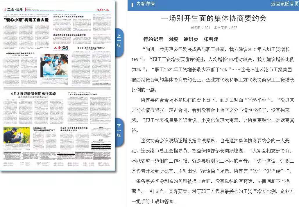 “為進一步實現(xiàn)公司發(fā)展成果與職工共享,我方建議2021年人均工資增長15%”;“職工工資增長要循序漸進,人均增長15%相對較高,我方建議增長比例為8%”;“職工2021年工資增長最少不低于10%”……這是在連云港市工投集團灌西投資公司的集體協(xié)商要約會上,企業(yè)方代表和職工方代表協(xié)商職工工資增長比例的一幕。