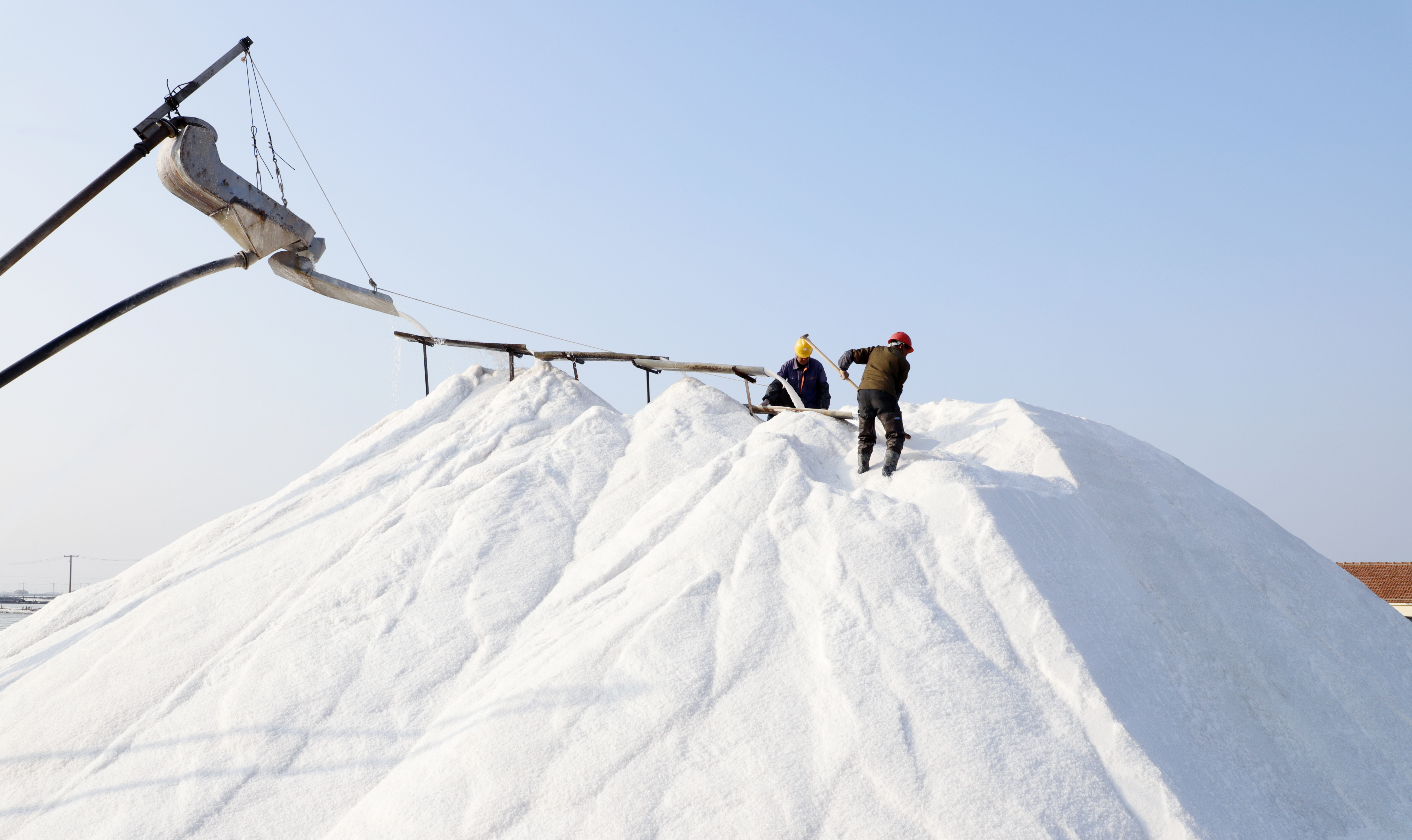 “春種一粒粟,秋收萬顆子”。又是一年春季,在大地上撒下種子,等待秋季收獲糧食。3月4日,日曬制鹽公司萬畝鹽田機器轟鳴,一池池“雪鹽”銀光閃閃,一條條“銀瀑”臨空而下,這里不是平日里土地上的春耕春種,而是利用潮汐收集海水,風(fēng)能、太陽能蒸發(fā)制鹵,最后結(jié)晶成鹽。