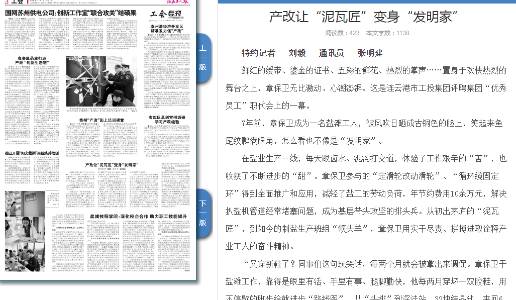 近年來(lái),連云港市工投集團(tuán)灌西公司為打通產(chǎn)業(yè)工人成長(zhǎng)成才的身份壁壘、價(jià)值體現(xiàn)壁壘及學(xué)習(xí)教育壁壘,開(kāi)辦技能培訓(xùn)“大課堂”,打造“一中心+三基地”職業(yè)教育平臺(tái),即金藍(lán)領(lǐng)技術(shù)工人培訓(xùn)中心和技能比武基地、技術(shù)創(chuàng)新基地、技能鑒定基地,構(gòu)建公司、單位和班組三級(jí)職業(yè)教育體系、技能培訓(xùn)體系和技能評(píng)定體系,引導(dǎo)產(chǎn)業(yè)工人重在技能深耕、求精、拔尖、攀高上磨練塑造。章保衛(wèi)正是在技能培訓(xùn)的“大課堂”中一步一步成長(zhǎng)起來(lái),他參與的“定時(shí)打鹵泵”、“管道輸送加壓法”、“低溫除硫工藝”等技術(shù)得到快速推廣,也讓他從普通員工成長(zhǎng)為“二星級(jí)優(yōu)秀員工”,被推選擔(dān)任制鹽生產(chǎn)班組長(zhǎng),每月工資增長(zhǎng)800元。這一切讓他獲得滿滿的榮譽(yù)感和幸福感。