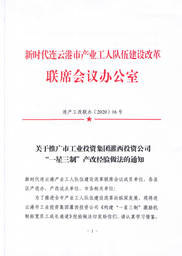 11月20日,新時代連云港市產(chǎn)業(yè)工人隊伍建設(shè)改革聯(lián)席會議辦公室在全市推廣工投集團(tuán)灌西投資公司“一星三制”產(chǎn)改經(jīng)驗。