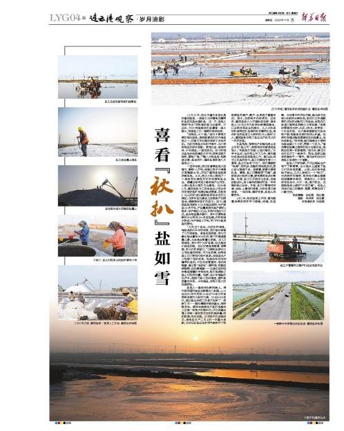 10月22日,在位于灌云縣東北角的灌西鹽場,一名鹽工正開著電動履帶扒鹽機在鹽池里扒鹽。這一天,鹽場人簡稱“秋扒”的秋季扒鹽已近尾聲。不遠(yuǎn)處,7000噸鹽堆成的鹽廩像一座小雪山,那是鹽工們一星期的勞動成果。