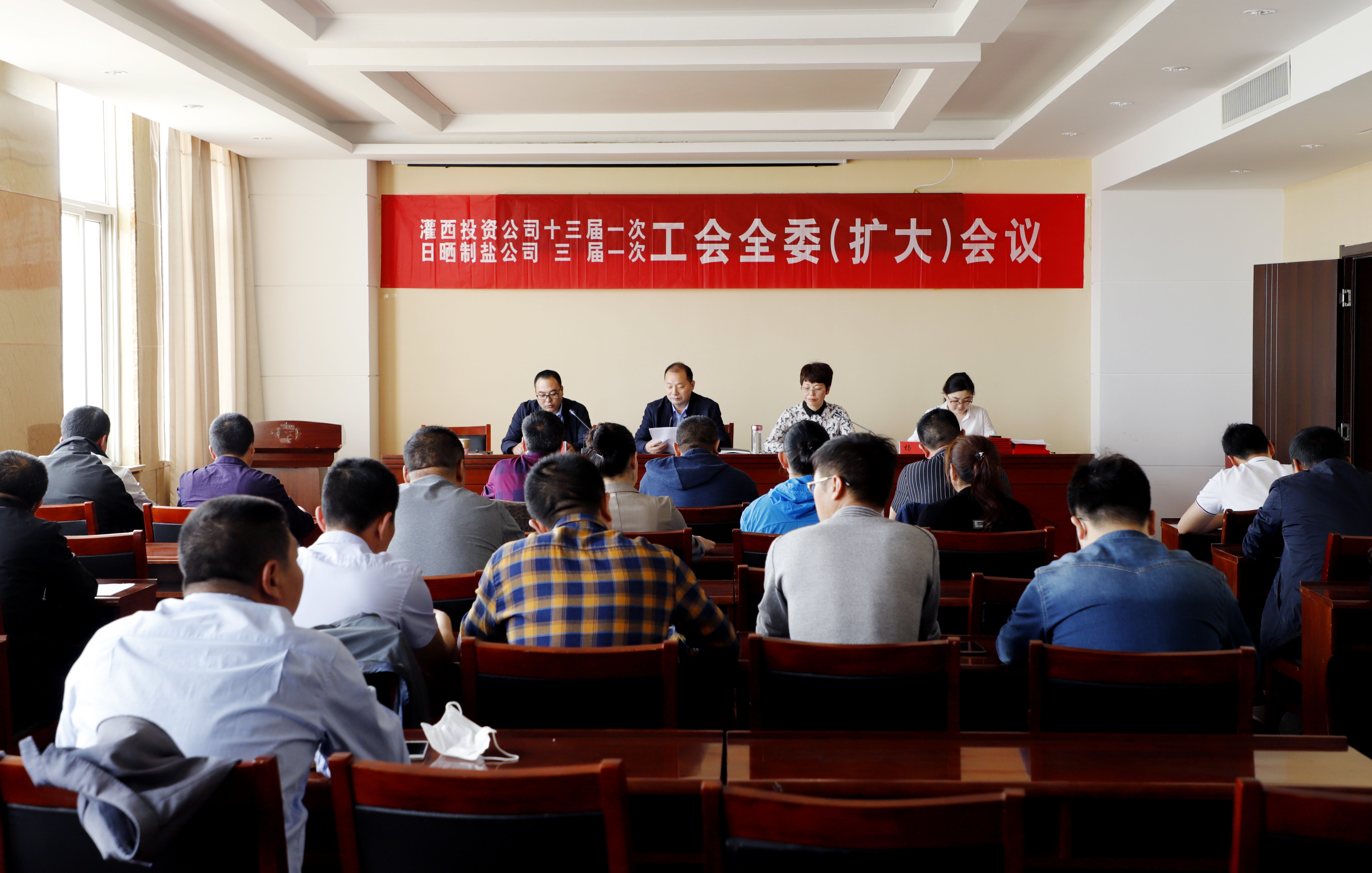 5月20日上午,灌西投資公司召開(kāi)十三屆一次、日曬制鹽公司三屆一次工會(huì)全委擴(kuò)大會(huì)議,公司黨委書(shū)記、董事長(zhǎng)、總經(jīng)理李國(guó)文出席會(huì)議并講話,工會(huì)主席王宏作工作報(bào)告。工會(huì)委員會(huì)全體委員,各單位工會(huì)主席、女工委主任參加會(huì)議。