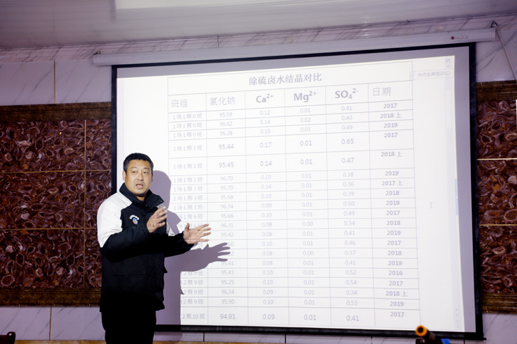 為進(jìn)一步提高日曬制鹽公司原鹽生產(chǎn)質(zhì)量,通過(guò)一年來(lái)的新鹵與老鹵長(zhǎng)鹽數(shù)據(jù)對(duì)比,使用全新鹵水長(zhǎng)鹽氯化鈉含量明顯提高,硫酸根離子、鈣離子也有所下降,使得分區(qū)曬鹽提高鹽質(zhì)提供了數(shù)據(jù)依據(jù)。此次培訓(xùn),深入講解了分區(qū)供鹵、老鹵區(qū)分、混合鹵水的分池結(jié)晶實(shí)施辦法以及在雨天收集淋板水,提高利用窮制鹵的途徑。培訓(xùn)中,圍繞礦鹵日曬制鹽技術(shù)及除硫工藝兩個(gè)方面,重點(diǎn)對(duì)鹽質(zhì)的管控、除硫的目的、意義、工藝流程等方面內(nèi)容進(jìn)行了講解,使參訓(xùn)人員特別是一線(xiàn)班組長(zhǎng)對(duì)鹽質(zhì)和除硫工作的重要性有了更深刻的認(rèn)識(shí),同時(shí)也為鹽質(zhì)鹽量的提升奠定了理論基礎(chǔ)。(張明建)