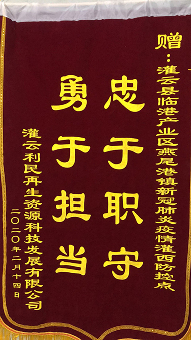 “非常感謝你們對(duì)我們?nèi)夜镜氖刈o(hù),為我們廣大職工筑牢了一道防疫情的銅墻鐵壁,你們辛苦了!”近日,連云港臨海新材、灌云利民再生資源、江蘇沙英喜三家公司分別為新冠肺炎疫情灌西防控點(diǎn)值守人員送來三面錦旗,感謝灌西投資公司值守人員在疫情期間為疫情防控工作作出的貢獻(xiàn)。