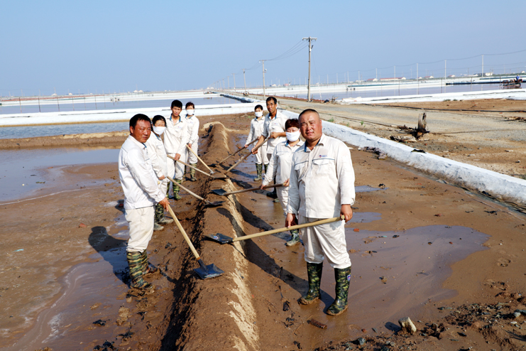 趁著休息的間隙,筆者與身邊忙得滿頭大汗的8班班長祝星星聊了起來。據(jù)祝星星介紹,每天員工4點(diǎn)半就到灘頭,進(jìn)行鹽池的人工活碴、稟基修復(fù)、鹽池鹵水補(bǔ)充、收放設(shè)備檢查等一系列工作,因此,合理安排工作量非常重要。他告訴筆者,室外工作工人的勞保服比較厚,一天下來工作服濕了又干,干了又濕,衣服上都泛出厚厚的鹽漬。一天下來,全班要消耗2大桶甚至更多的飲用水。現(xiàn)在公司里對我們一線生產(chǎn)崗位員工非常關(guān)心,防暑降溫工作非常到位。最近,單位又為我們發(fā)放高溫津貼、電風(fēng)扇、防暑降溫藥品。這些讓我們員工真切感受到組織的力量,組織得偉大,所以雖說現(xiàn)在比平時更辛苦,我們有信心戰(zhàn)高溫、奪高產(chǎn)。