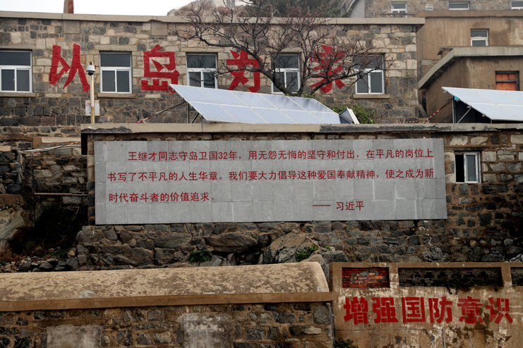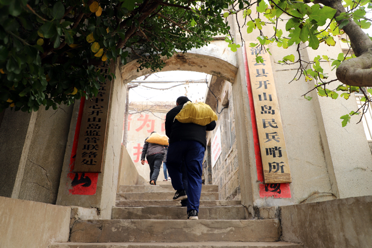 上午8點,在發(fā)動機巨大的轟鳴聲中,漁船緩緩駛離港口。近一個小時的顛簸,開山島出現在了視野里,由小到大,逐漸清晰。簡易碼頭上,守島民兵遠遠地沖著大家揮手,船上的人顧不上漁船的劇烈晃動,一個個扒著船沿熱情回應著,所有人的臉上都寫滿敬意和期待。漁船隨著海浪的節(jié)拍上下晃動著,班組長們登上碼頭,就緊緊握住守島民兵的手,對他們守島衛(wèi)國,無怨無悔堅守和付出的愛國奉獻精神表示欽佩。班組長們跟隨著守島民兵沿著王繼才夫婦他們當年的巡邏路線,拾級而上,大家一邊感受巡島爬山的辛苦,一邊聆聽著守島民兵講解王繼才夫婦32年守島的艱難困苦和生離死別。