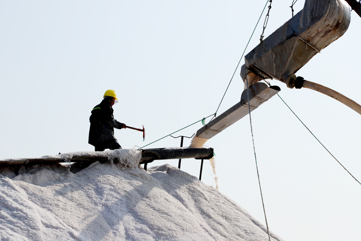 在13班扒鹽現(xiàn)場(chǎng),一臺(tái)T30扒鹽機(jī)正在鹽池里進(jìn)行扒鹽工作,T30操作手駕駛著機(jī)械,在鹽池中緩緩的行進(jìn)著,不時(shí)回頭觀(guān)察鹽泵吸鹽情況,保障扒鹽管道順暢。遠(yuǎn)處的廩基內(nèi),大廩工正在熟練地利用分流板對(duì)鹽篩中傾瀉下的原鹽進(jìn)行引導(dǎo)分流,熟練地打好廩墻。
