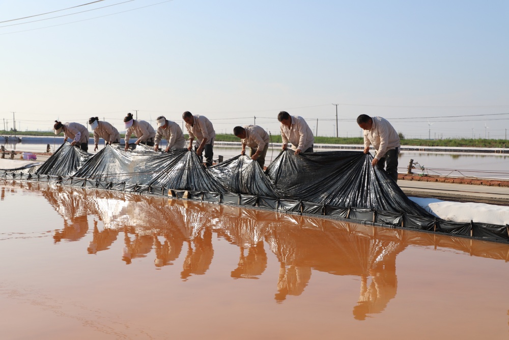 在破曉時(shí)分,日曬制鹽的萬畝鹽田被一輪旭日染上了一層金色的光輝,仿佛一夜之間,這片鹽堿地被冰封的魔力所籠罩,呈現(xiàn)出一種寧靜而又深邃的景象。凌晨4點(diǎn)半,那些勤勞的鹽灘工人早已熱火朝天地忙著活碴、修補(bǔ)塑布、加固浮板等保鹽保鹵工作。省勞模祝星星在巡灘時(shí)說道:“現(xiàn)在正處梅雨季節(jié),我們戰(zhàn)高溫、搶晴天,在做好原鹽生產(chǎn)的基礎(chǔ)上,更要統(tǒng)籌做好防汛抗災(zāi)工程,確保安穩(wěn)度汛。當(dāng)然,我們對(duì)今年超額完成生產(chǎn)指標(biāo)任務(wù)充滿信心。”這番話無疑是對(duì)他們辛勤勞作的一種樂觀詮釋。