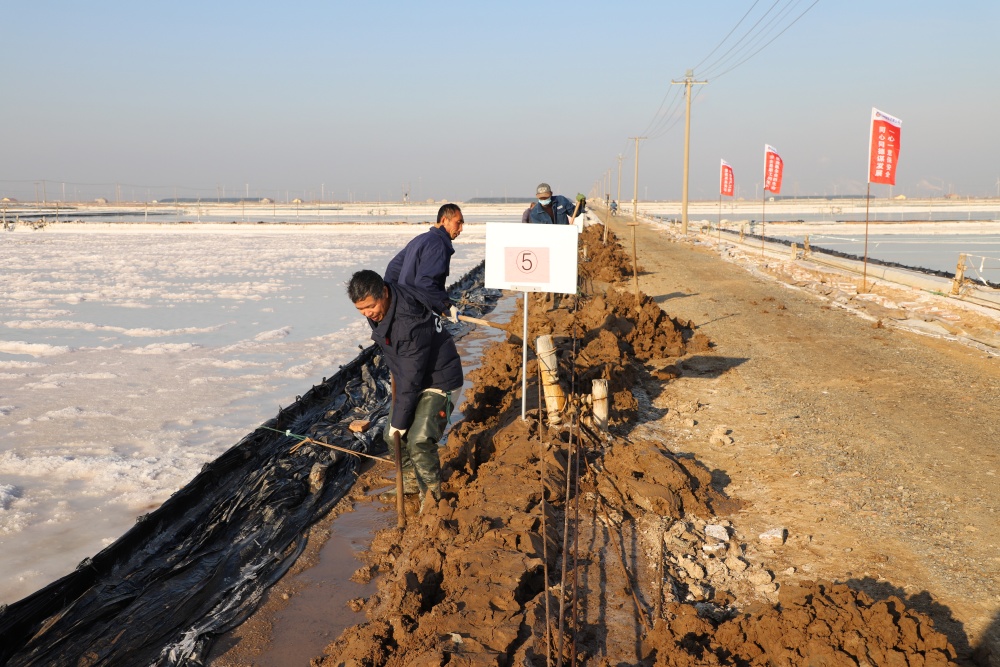 寒冬時節(jié),暖陽之下,鹽廩之旁,曬得黝黑的鹽場產(chǎn)業(yè)工人們按照競賽的考核標準,做熟泥、打堰墻、做堰頂,護埝頂、夯埝坡、清塘底,見證了一場技能比拼的盛會。經(jīng)過一天的鏖戰(zhàn),潘成軍師徒取得了池堰修整第一名;董治波師徒取得了土塘清淤第一名。(西工)