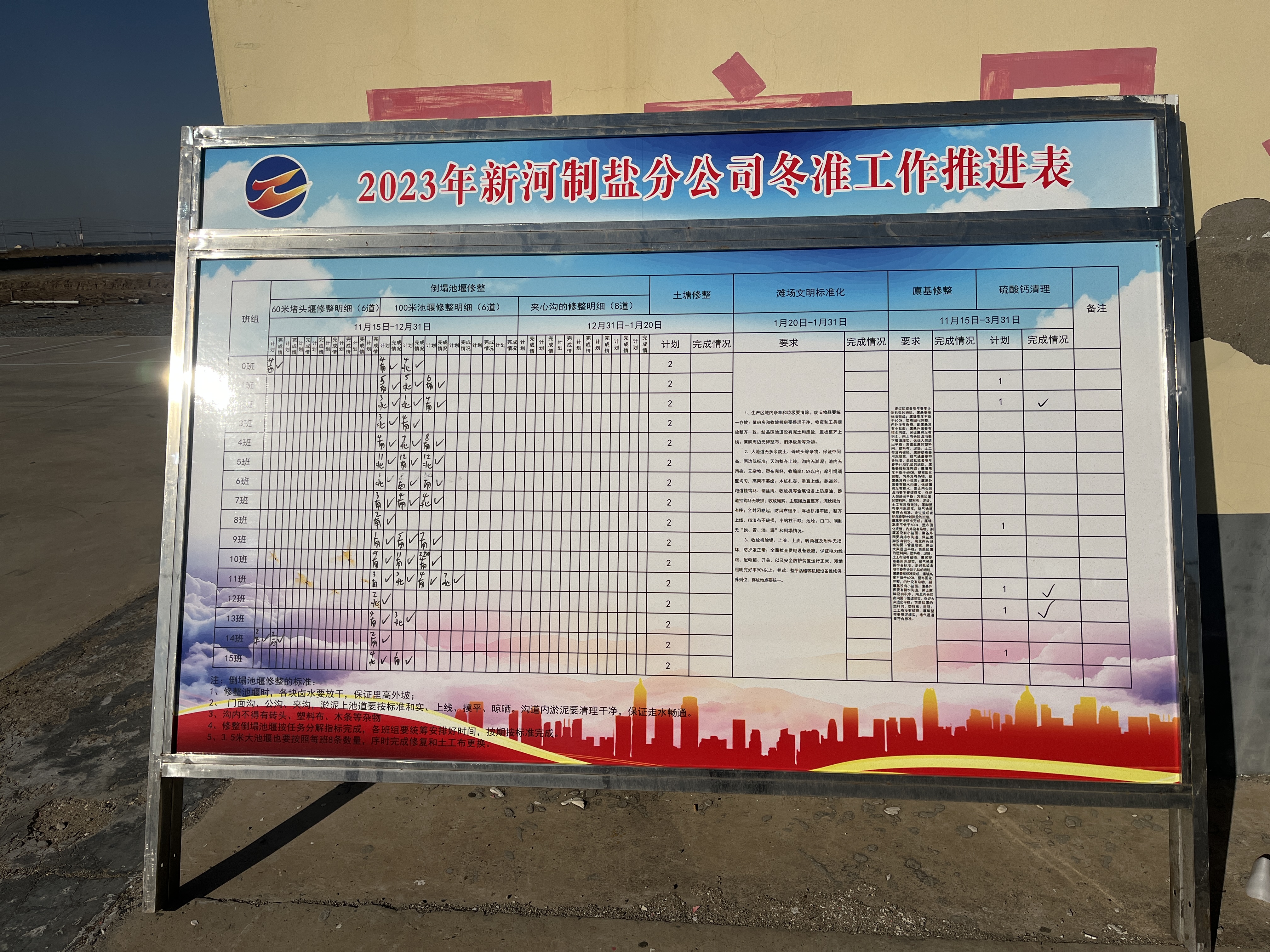 冬季是日曬制鹽收儲鹵水、扒土塘、整理灘場文明的最佳時期,也是為2024年工作起好頭、邁好步的關(guān)鍵時期,自冬準工作開展以來,新河制鹽分公司制定冬準工作推進表,掛圖作戰(zhàn)按時推進冬準進度。