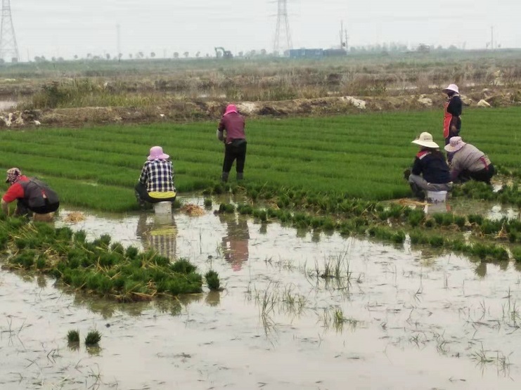 連日來,工人們克服天氣炎熱等因素,搶時間趕進度。在明威公司稻田里隨處可見一片繁忙景象:拔秧的,捆秧的,插秧的,她們按照勻、整、齊的標準,不一會兒,一排排秧苗整齊地立在了水田中,構成一幅美麗的田園畫卷。