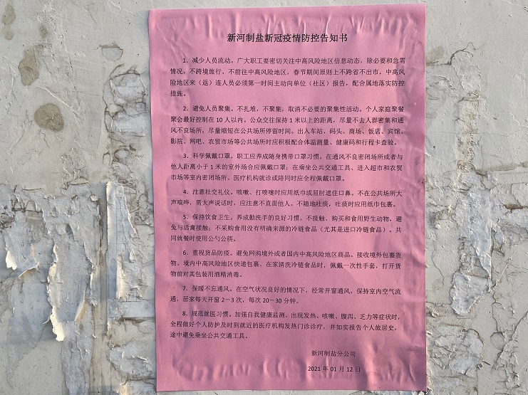 春節(jié)臨近,人員流動增加,根據(jù)灌西投資公司疫情防控工作的需要,結(jié)合冬春季疫情形勢,為切實加強(qiáng)生產(chǎn)一線疫情防控工作 ,進(jìn)一步防范疫情輸入,提高職工自我防護(hù)意識,新河制鹽分公司1月12日在公司醒目位置張貼《疫情防控告知書》,并對各個班組發(fā)放《疫情防控告知書》,每位員工簽字并存檔。