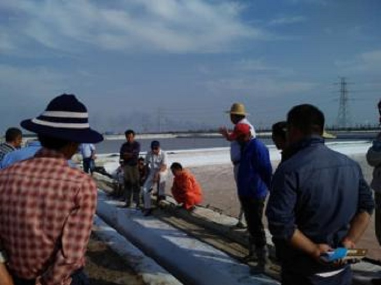 該分公司一班人帶著十六名班長(zhǎng),到新河零班做加鹵“天溝”工作現(xiàn)場(chǎng)。剛到目的地,站在打好的溝頭,一眼望去,二條溝口線筆直,和熟捯實(shí)的粘埝泥輕而易舉承載著人的重量。此條加鹵“天溝”嚴(yán)格按日曬制鹽公司規(guī)格標(biāo)準(zhǔn)而建,溝長(zhǎng)約210米,上口寬55cm,下口寬30cm,溝深45cm,溝底坡勢(shì)順沿三排到頭排由淺至深。做好的一條加鹵溝, 可以為六塊結(jié)晶池扒鹽期間分別添加鹵水,減少洗鹽鹵水進(jìn)其它池塊的二次污染。