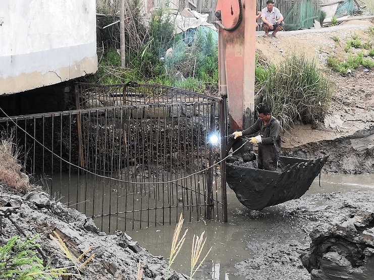 由于小站河道長(zhǎng)期未清理,淤泥和廢棄物的堆積,對(duì)小站機(jī)泵打水造成阻礙,降低了機(jī)泵打水速度,造成耗時(shí)增長(zhǎng)、耗電量增加,嚴(yán)重影響了小站閘工的工作效率。因此資源公司動(dòng)用兩臺(tái)挖掘機(jī)對(duì)小站河道進(jìn)行了扒淤和廢棄物清理工作,并增設(shè)自制潮檔阻擋廢棄物進(jìn)入機(jī)泵附近,防止廢棄物纏上機(jī)泵的水葉,對(duì)機(jī)泵造成損傷。