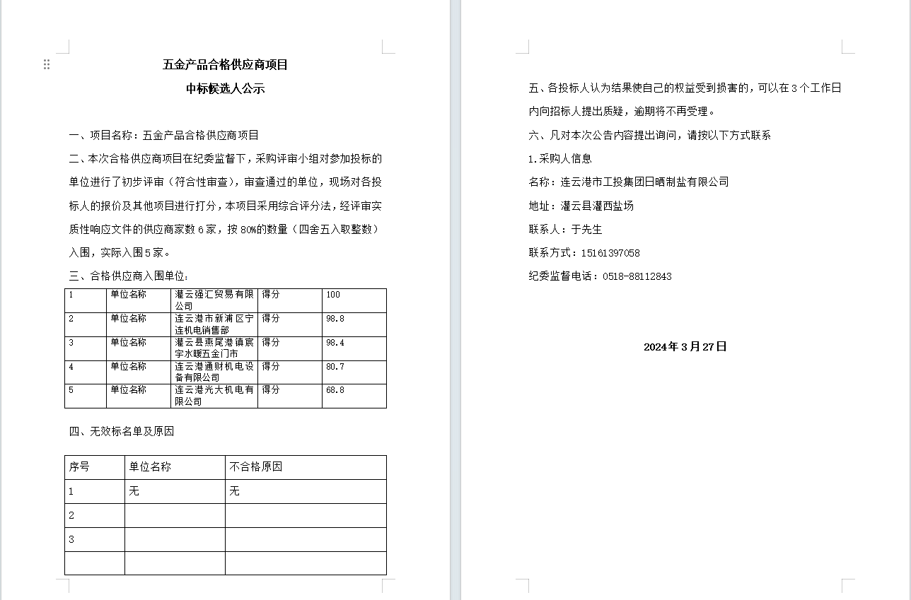 五金產(chǎn)品合格供應(yīng)商項目中標候選人公示